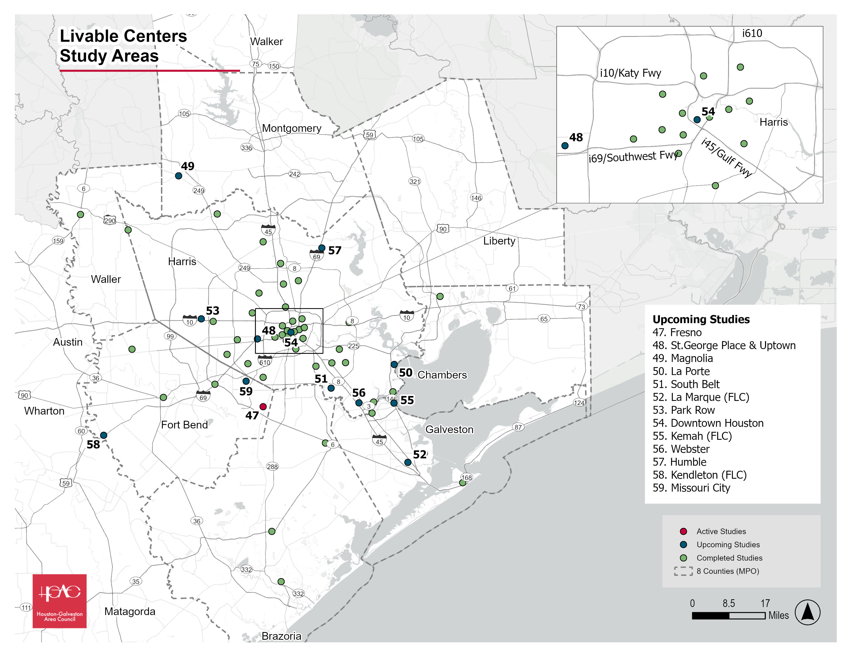 The study area covers 25 square miles and is located south of Loop 610, bordered on the north by Main Street, to the south by McHard Road, to the east by Almeda Road, and the west by Fondren Road. The area contains a mixture of land uses including residential neighborhoods, commercial corridors, industrial establishments, and undeveloped land. Completed in 2022.