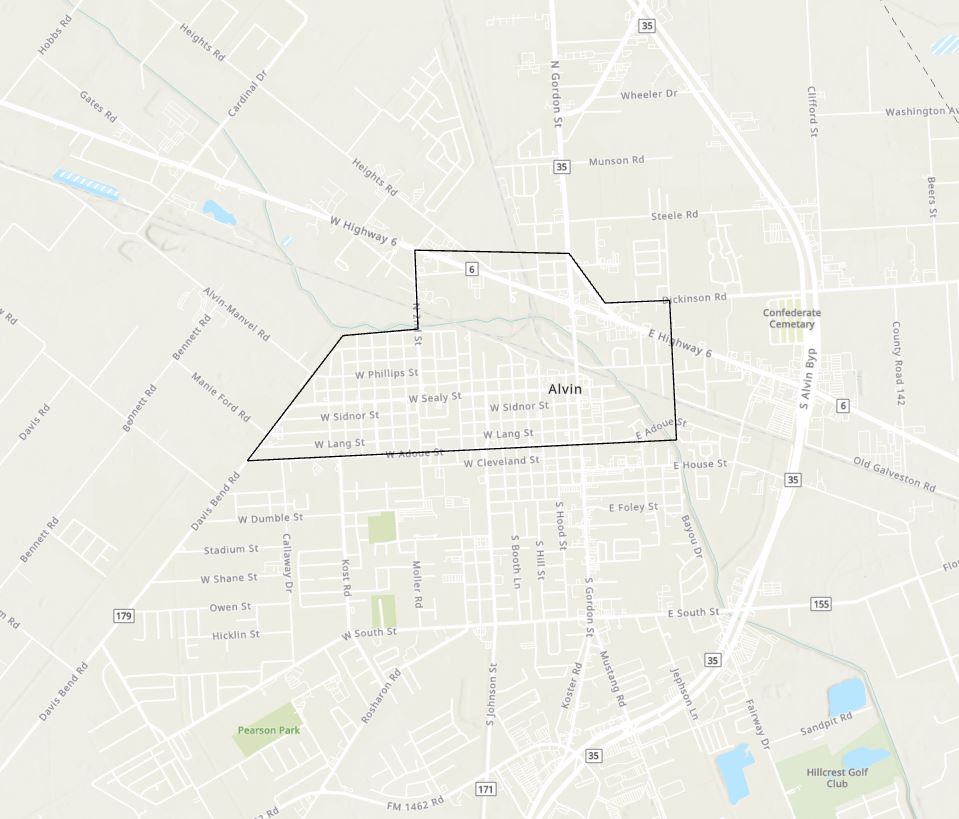 The Alvin Livable Centers Study is 13.18 square miles and contains Alvin's historic downtown that includes the Alvin Senior Center, Alvin Historical Museum, City Hall, and the Chamber of Commerce. The boundary includes a community garden, seven city parks, the Tom Blakeney Jr. Hike and Bike Trail, numerous businesses, and residential neighborhoods. The study area is bordered by Shirley Street to the East, Dickinson Road to the North, Dilling Street to the Northwest, 2nd Street to the West, Lobitt Street to the North, Davis Bend Road (CR 179) to the Southwest and Stadium Drive to the South.