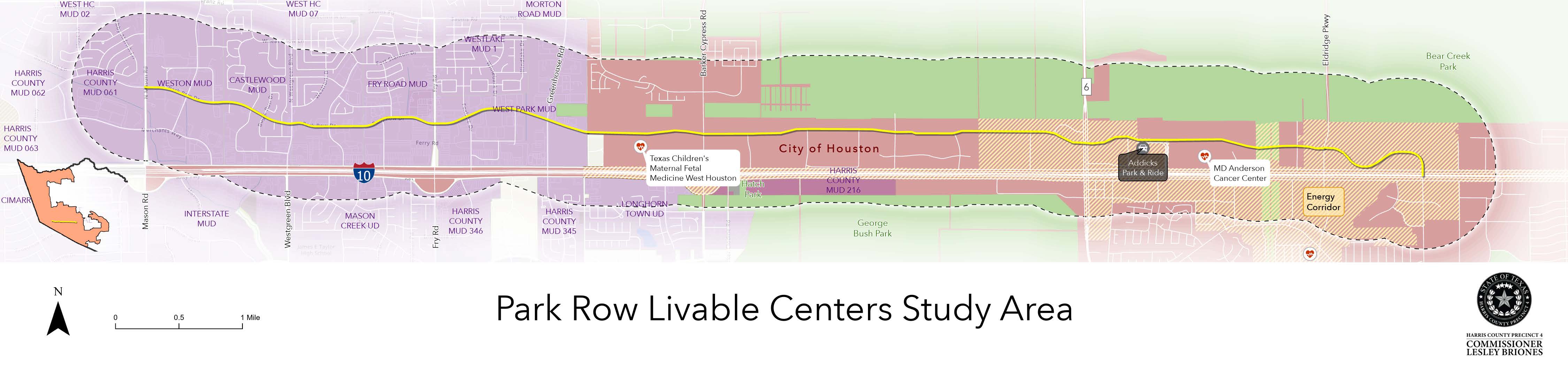 The Park Row Livable Center Study will help the sponsor, Harris County Precinct 4, identify and prioritize investments in active transportation and mixed-use development infrastructure. The Study’s primary goal is to bridge a six-mile gap between two existing active transportation networks, making the area safer and more accessible for pedestrians, cyclists, and transit users. It builds on previous planning efforts such as the West Harris County Transit Study, Energy Corridor Mobility Plan, and Katy East Community Plan.