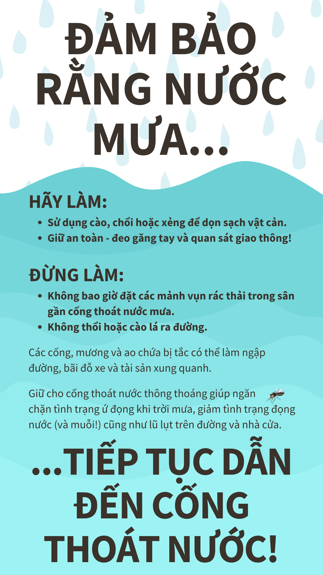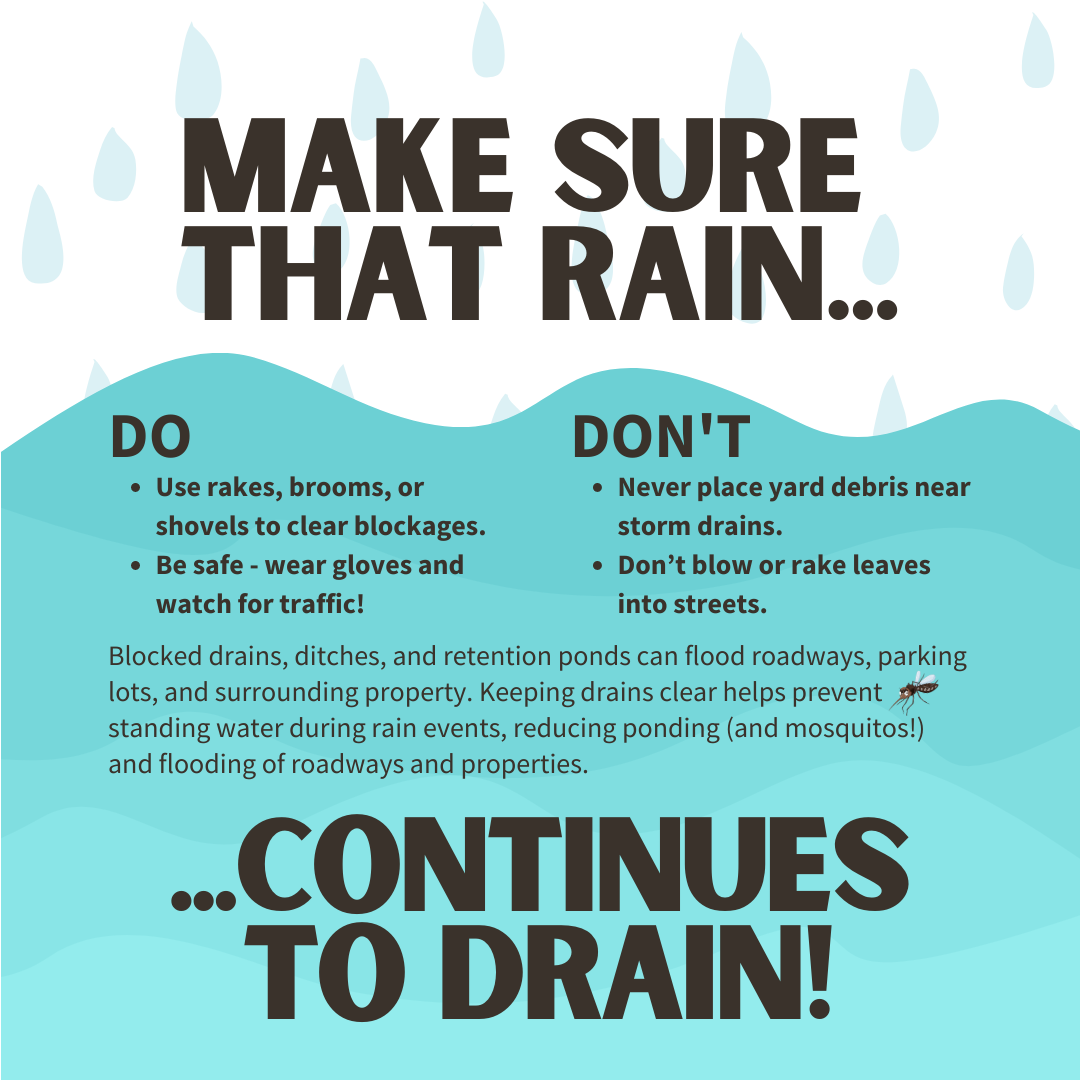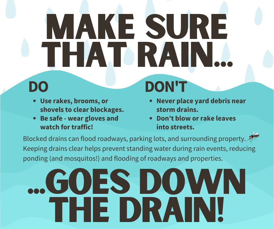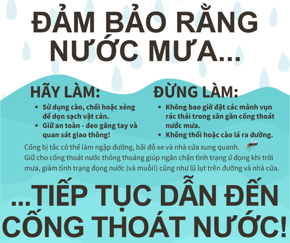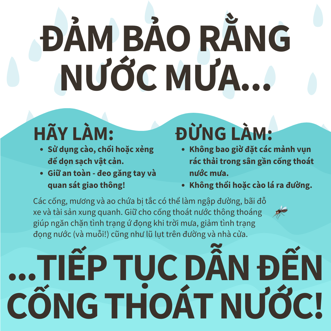 Giữ cho cống thoát nước thông thoáng giúp ngăn chặn tình trạng ứ đọng khi trời mưa – giảm tình trạng đọng nước (và muỗi!) cũng như lũ lụt trên đường và nhà cửa. Để biết thêm thông tin, hãy truy cập www.putlinkhere.com. Chúng tôi xin cảm ơn sự hợp tác của quý vị. #StormDrains #Stormwater #Flooding |