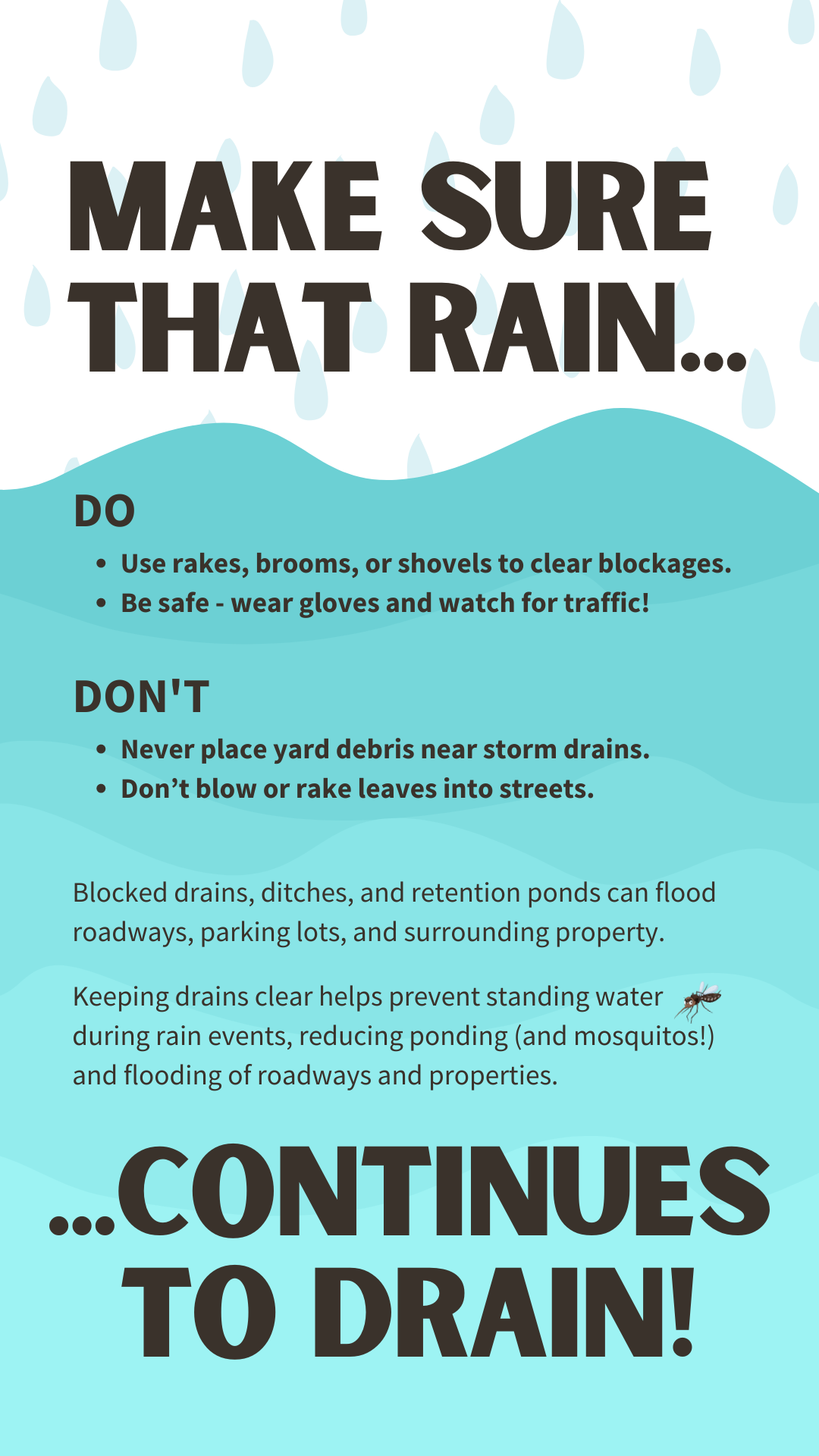 Mantener los desagües despejados ayuda a evitar que el agua de lluvia se estanque, lo cual reduce los charcos (¡y los mosquitos!) y la inundación de calles y propiedades. Para más información, visite www.putlinkhere.com. Gracias por su cooperación. #StormDrains #Stormwater #Flooding |