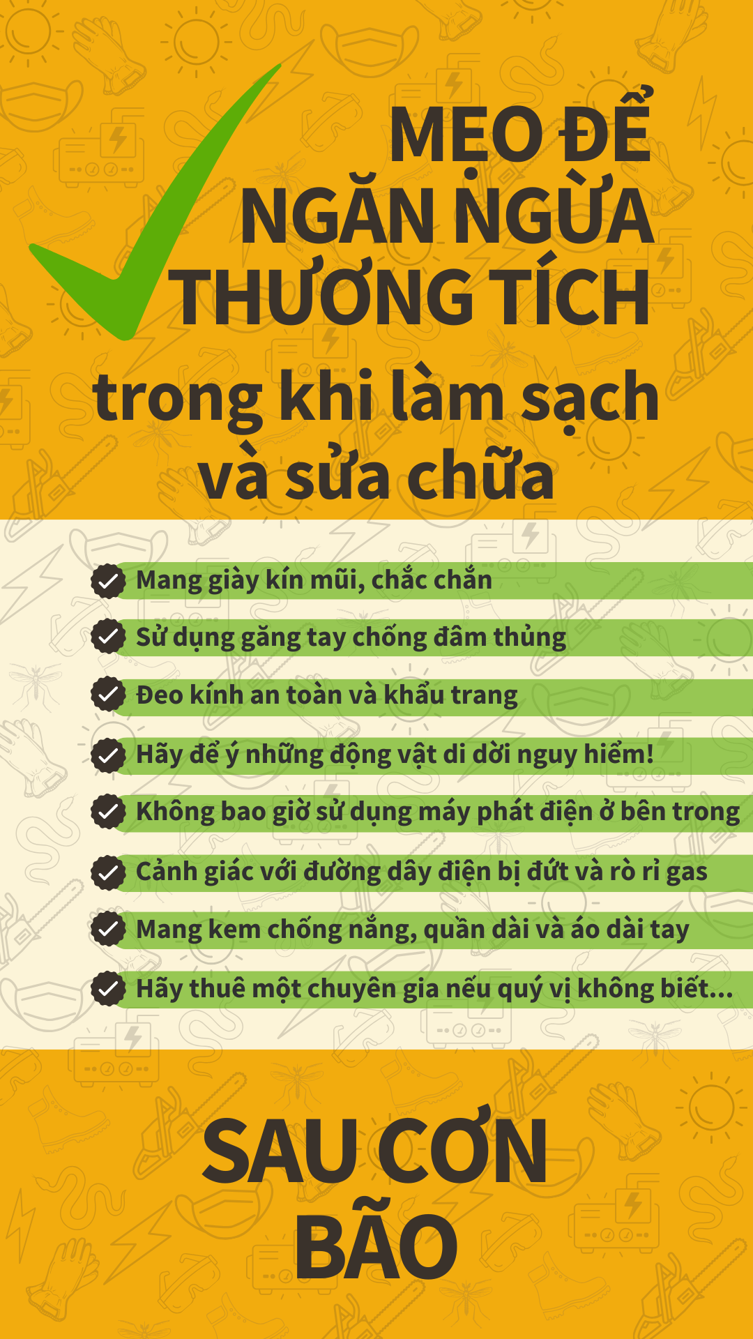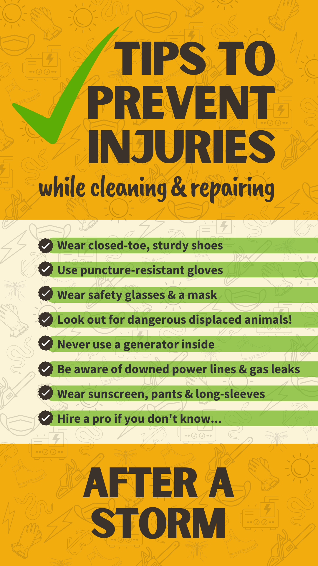 Hãy nhớ, những người ứng cứu tuyến đầu đã căng thẳng hết sức sau thảm họa, đừng để họ phải nhận thêm cuộc gọi chỉ vì một chấn thương có thể phòng tránh được! Để biết thêm thông tin, hãy truy cập www.putlinkhere.com. Chúng tôi xin cảm ơn sự hợp tác của quý vị. #SafetyFirst #AfterTheStorm #HurricaneRecovery #DisasterRecovery |