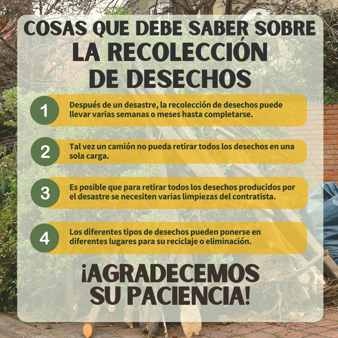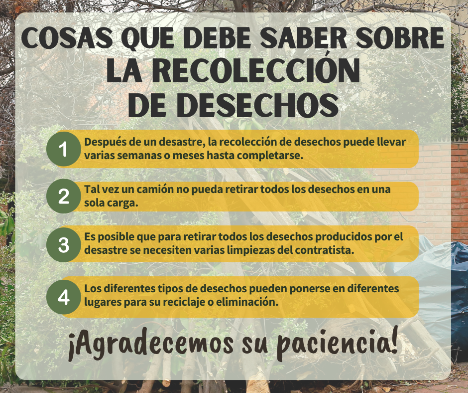 Programación de las operaciones de limpieza de desechos El personal y los contratistas están trabajando intensamente para retirar los desechos de la manera más rápida y segura posible. Agradecemos su paciencia. Mientras continúa la limpieza, tenga en cuenta lo siguiente: