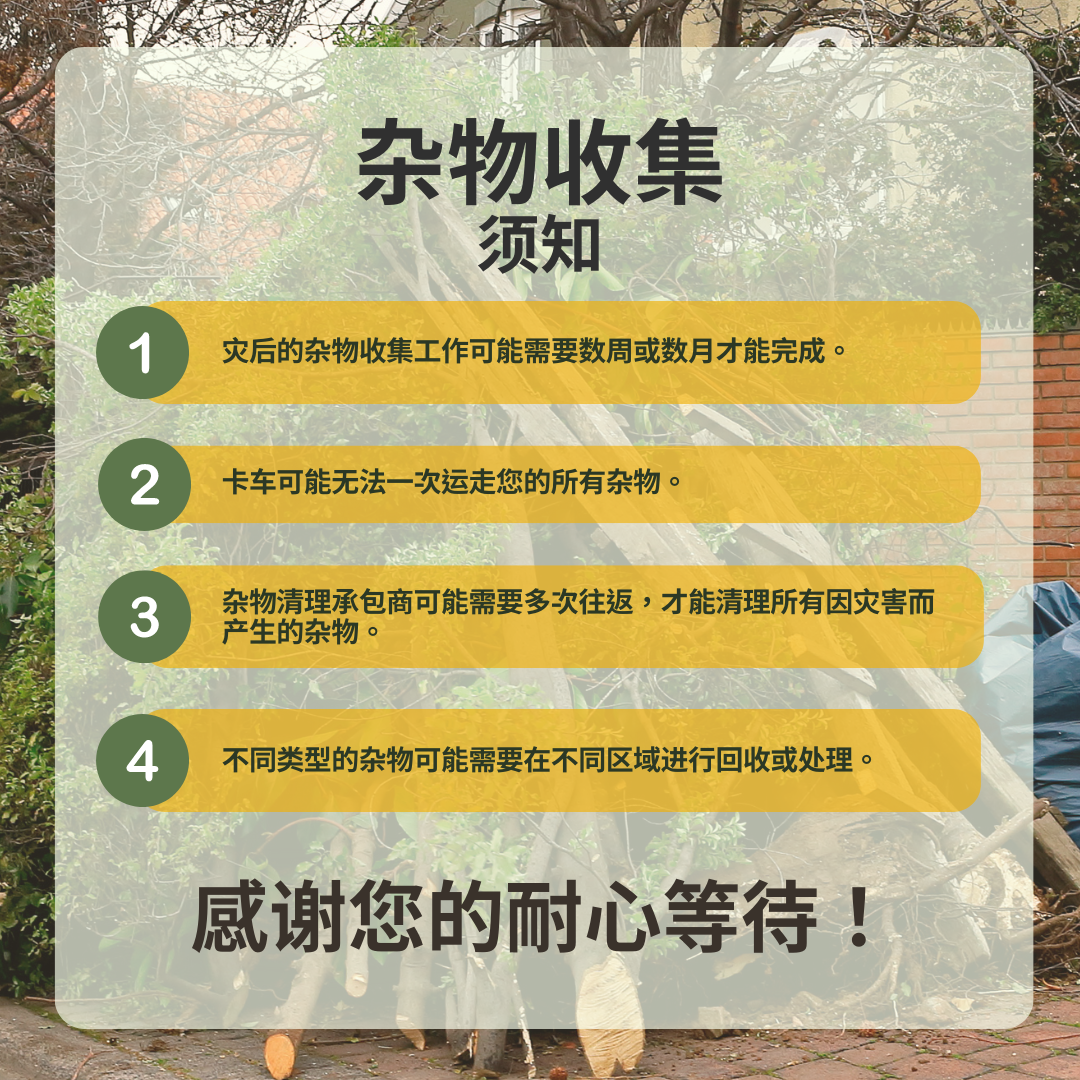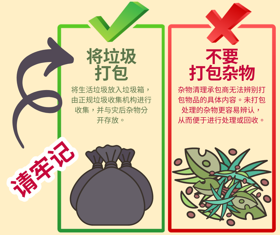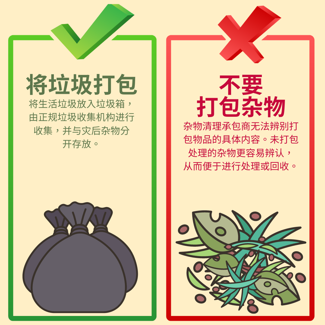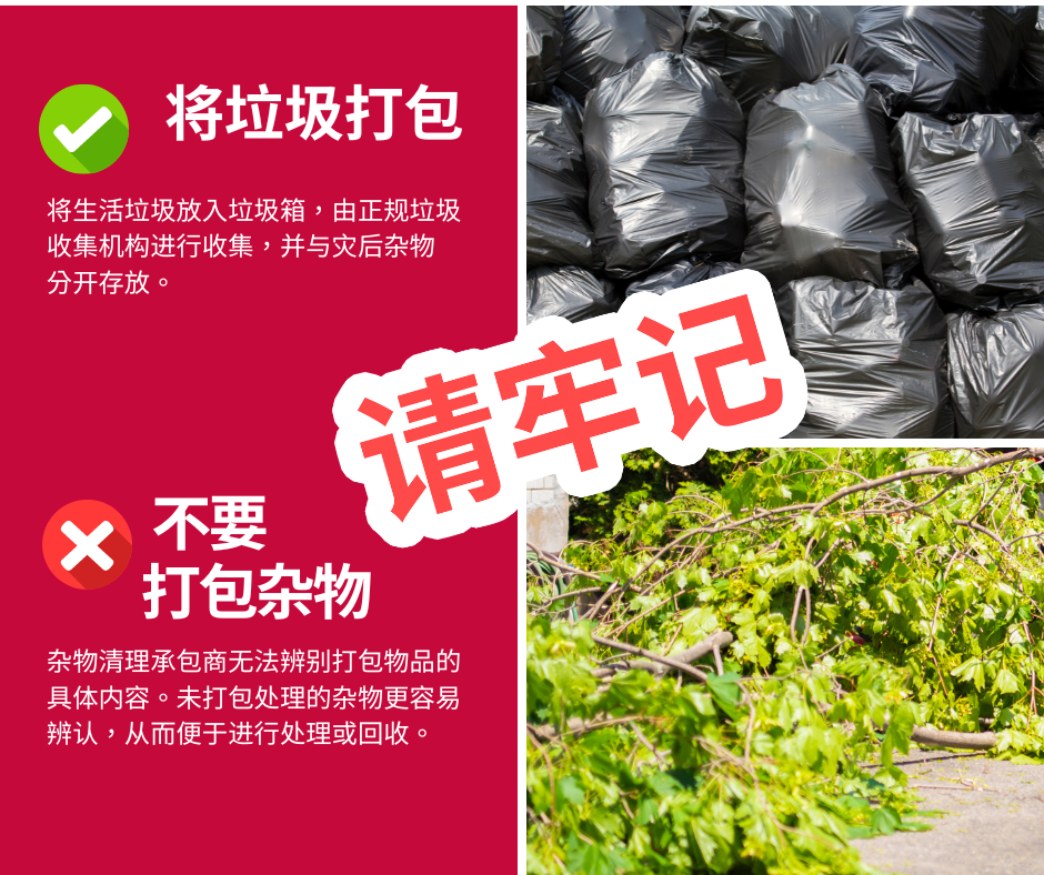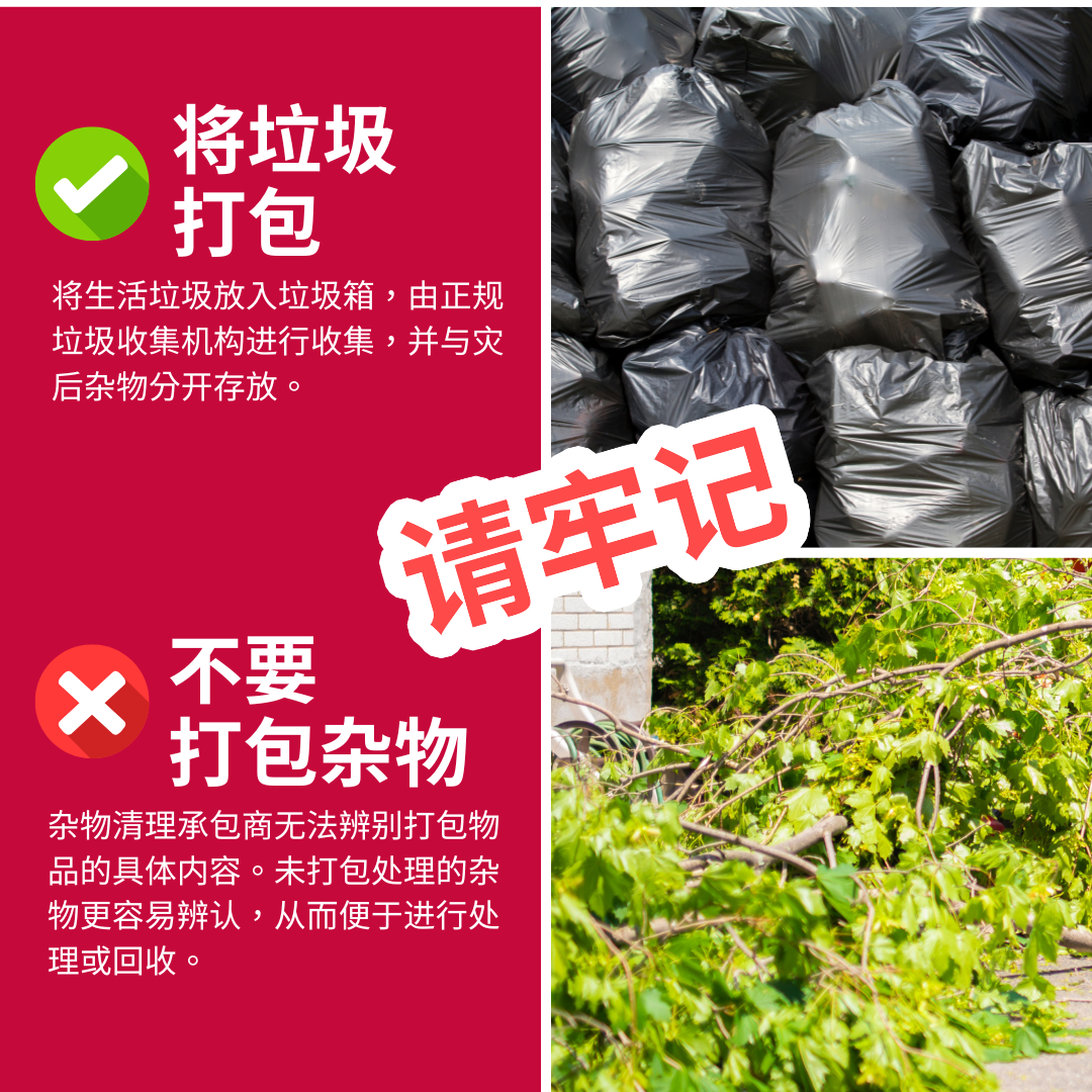 杂物和垃圾 为加快灾后杂物清理工作,请遵循以下贴士: 🚫请勿将杂物打包 👌请将普通垃圾打包 将杂物与垃圾分开存放将有利于社区加快灾后恢复工作进程! 要查看更多信息,请访问 www.putlinkhere.com。感谢您的配合。 #灾后杂物 #灾后恢复 |