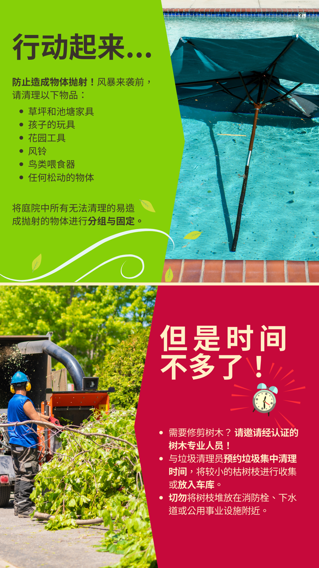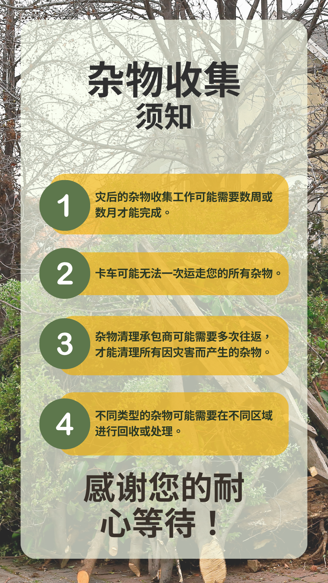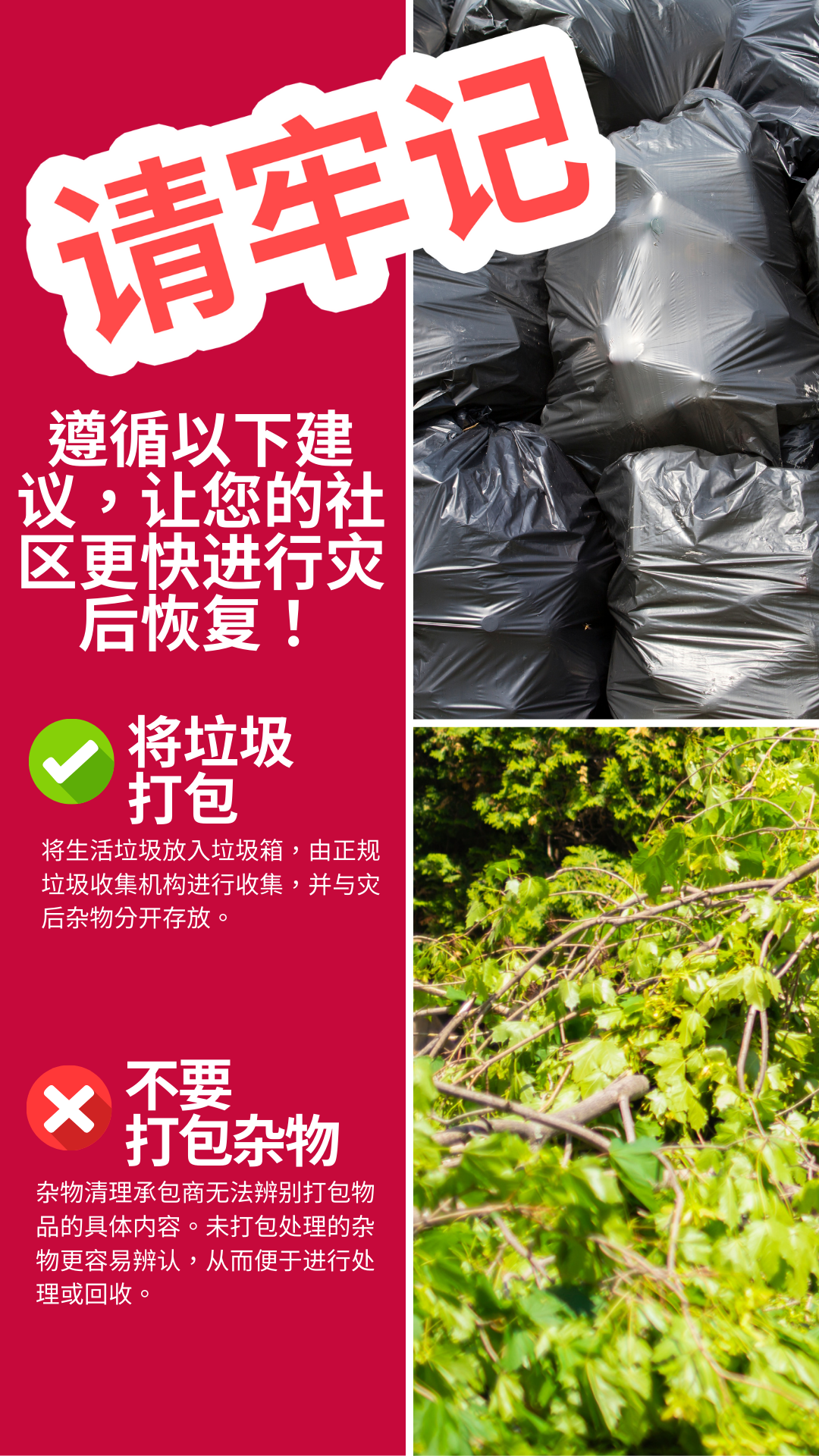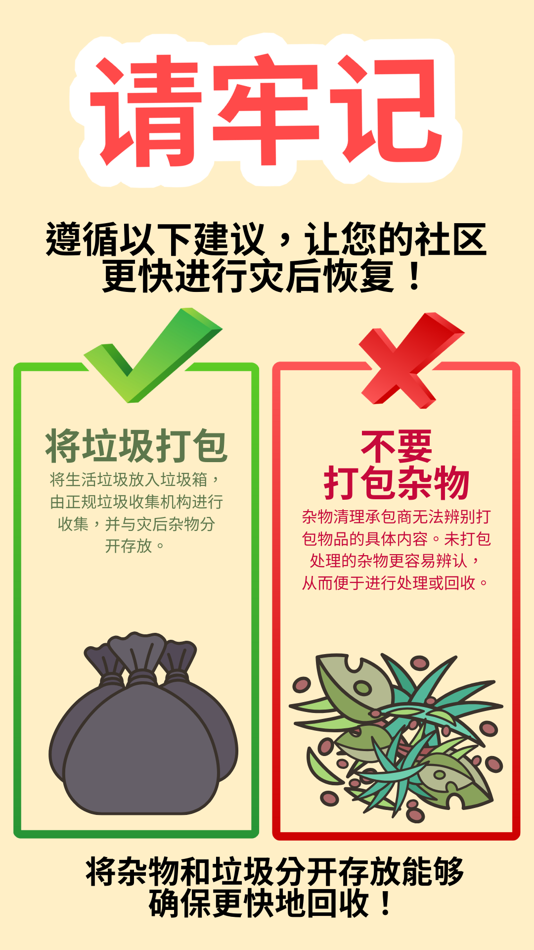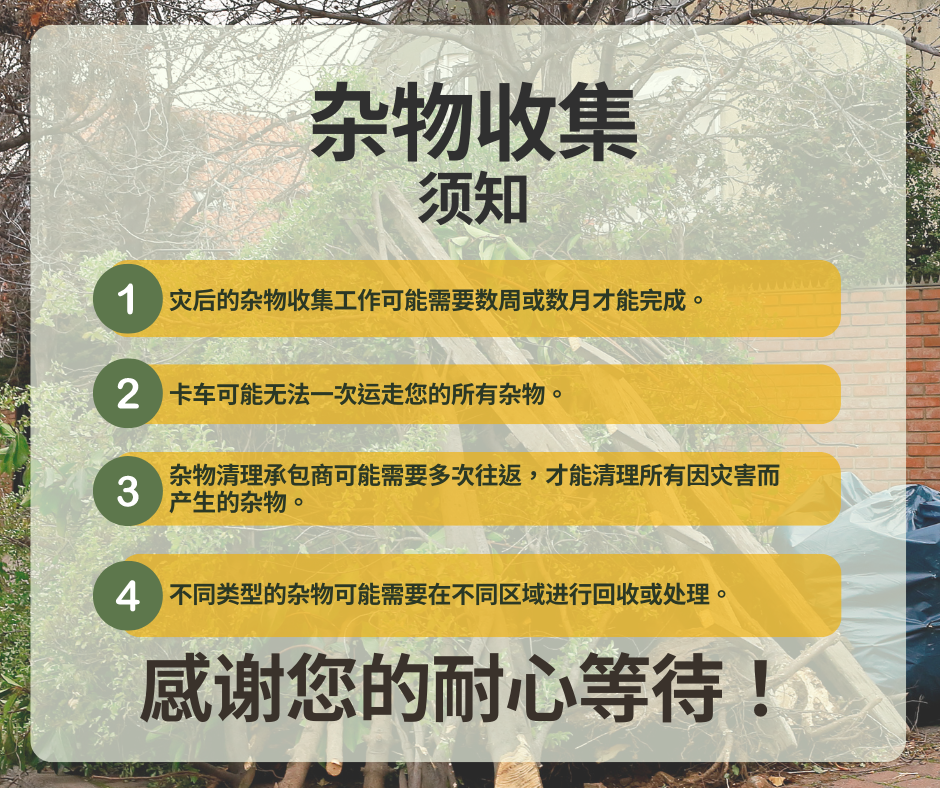 杂物和垃圾 为加快灾后杂物清理工作,请遵循以下贴士: 🚫请勿将杂物打包 👌请将普通垃圾打包 将杂物与垃圾分开存放将有利于社区加快灾后恢复工作进程! 要查看更多信息,请访问 www.putlinkhere.com。感谢您的配合。 #灾后杂物 #灾后恢复 |