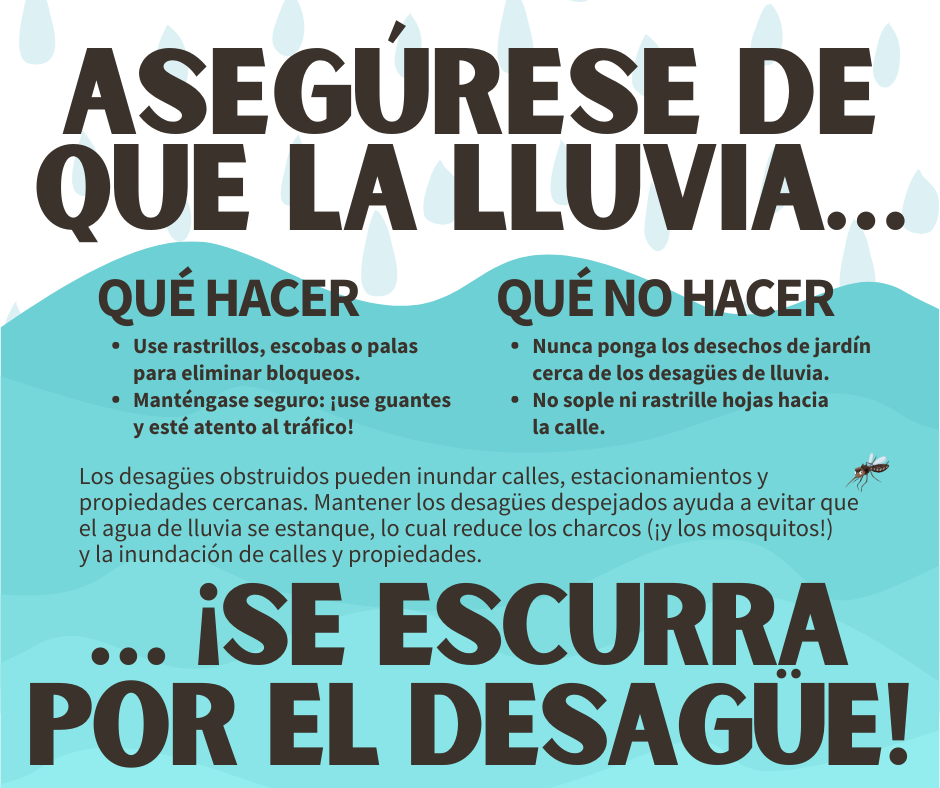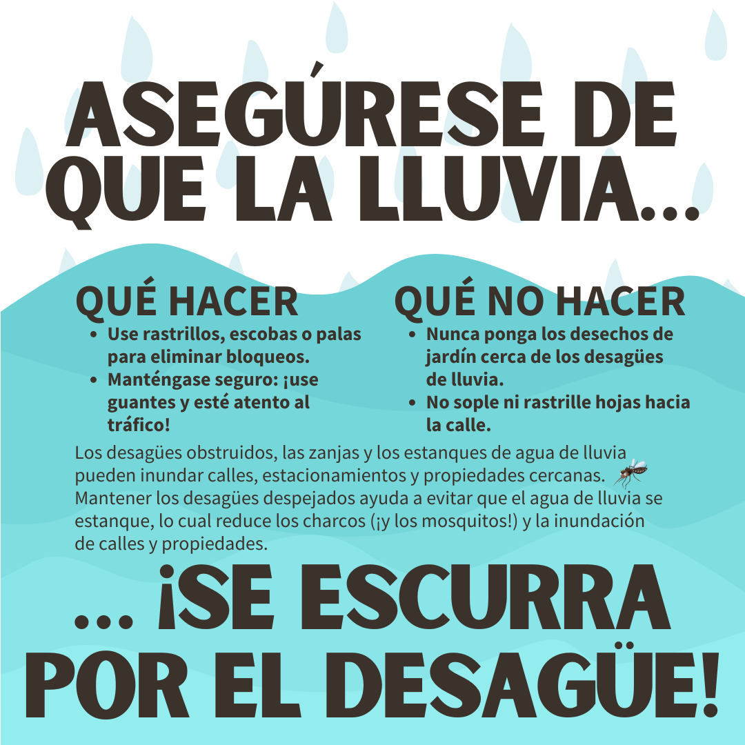 ¡ASEGÚRESE DE QUE LA LLUVIA SE ESCURRA POR EL DESAGÜE! ¡Usted puede ayudar a prevenir inundaciones localizadas en su vecindario! Siga estos consejos para mantener el flujo del agua de lluvia en la dirección correcta: QUÉ HACER: