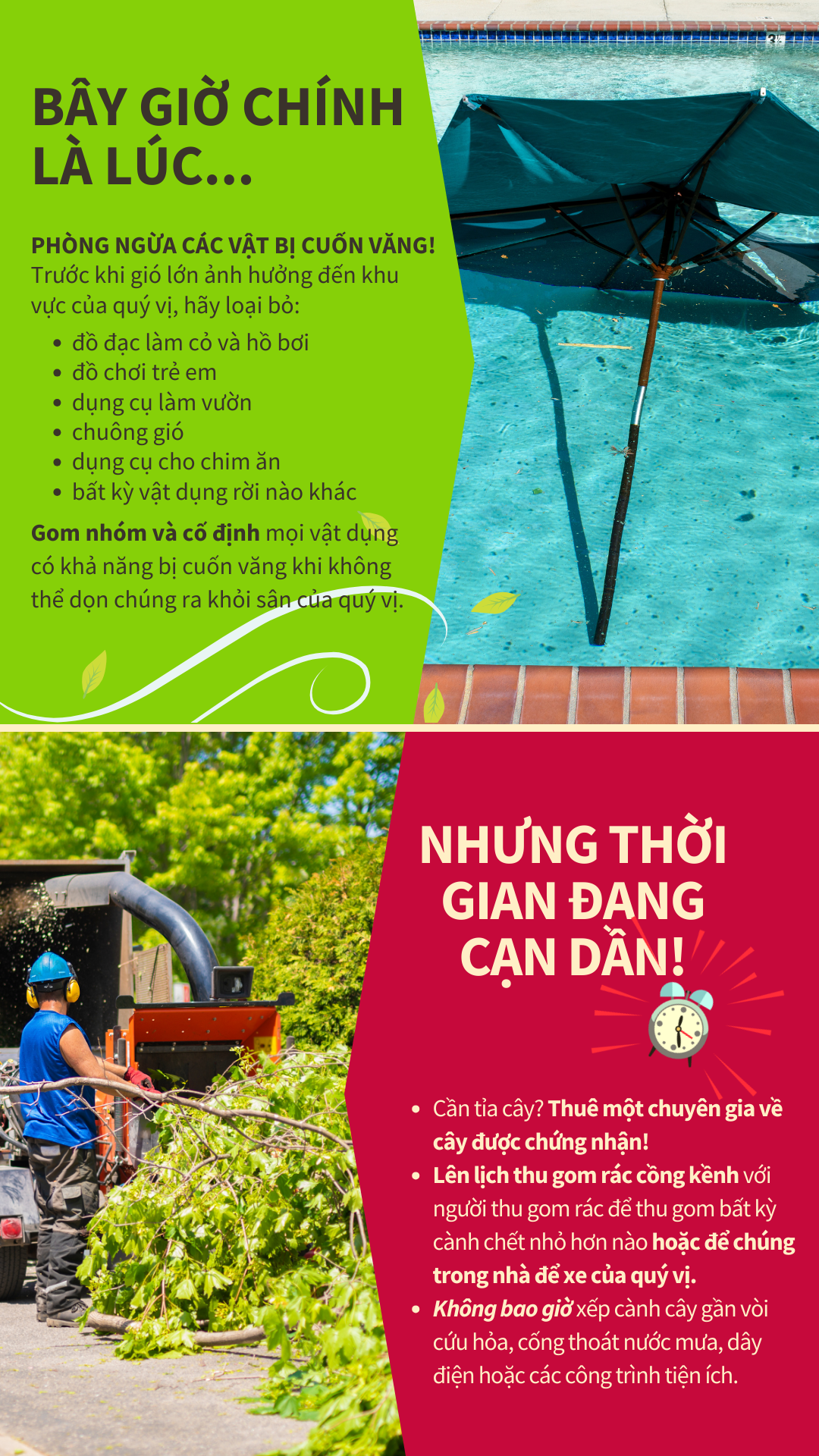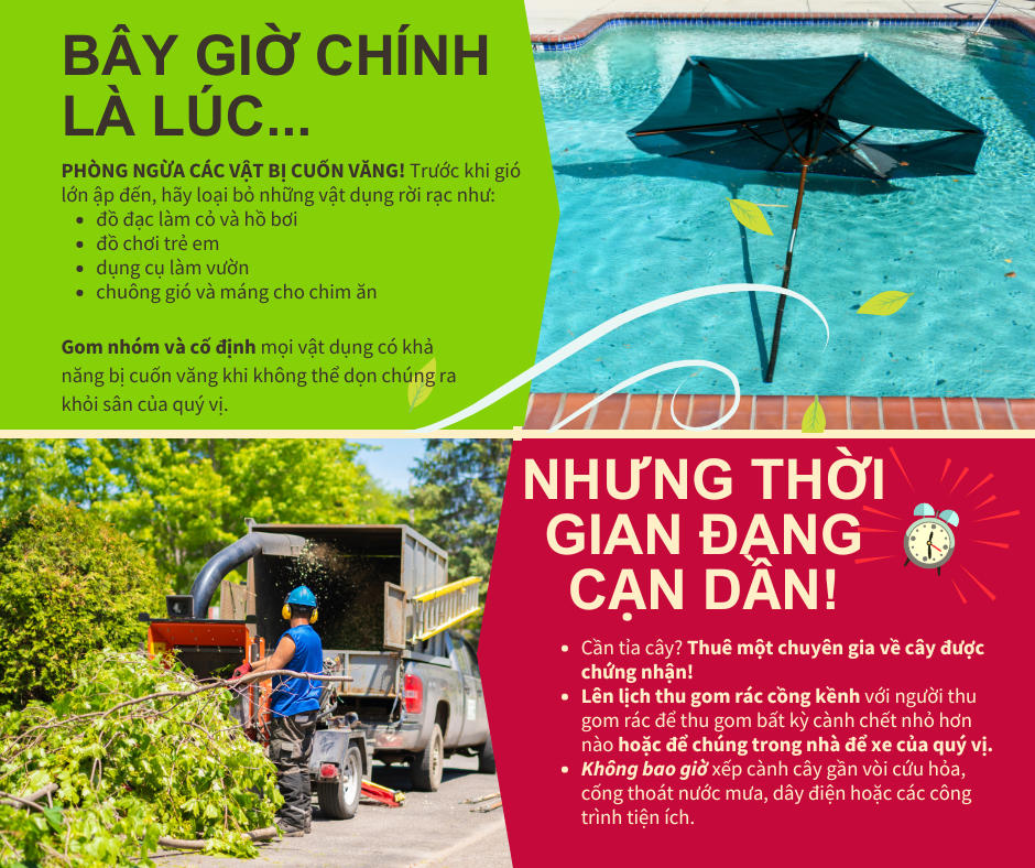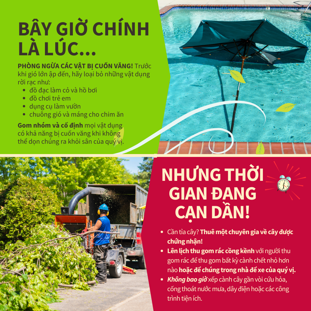 Giảm Thiểu Vật Bị Cuốn Văng ☝️ Để chuẩn bị cho (Tên Bão nhiệt đới/Bão), hãy kiểm tra sân nhà quý vị để tìm các vật thể có khả năng bị gió cuốn văng. Các vật dụng hàng ngày xung quanh nhà quý vị có thể trở thành vật bị cuốn văng gây chết người khi có gió lớn bao gồm đồ đạc trên bãi cỏ, đồ chơi trẻ em, dụng cụ làm vườn, chuông gió, máng cho chim ăn, v.v. Những đồ vật không thể chuyển đi phải được nhóm lại với nhau và buộc chặt để ngăn chúng bay vào không trung. 🌳Thời điểm cắt tỉa cây cối của quý vị là trước mùa bão. Nếu quý vị phải tỉa cây để ngăn cành chết có khả năng gây hư hỏng hoặc tổn hại cây, hãy thuê chuyên gia về cây được chứng nhận. Lên lịch thu gom rác cồng kềnh với người thu gom rác để thu gom bất kỳ cành chết nhỏ hơn nào hoặc để chúng trong nhà để xe của quý vị cho đến khi cơn bão đi qua. Không bao giờ xếp cành cây gần vòi cứu hỏa, cống thoát nước mưa, dây điện hoặc các công trình tiện ích. Để biết thêm thông tin, hãy truy cập www.putlinkhere.com. Chúng tôi xin cảm ơn sự hợp tác của quý vị. #StormPreparation #TropicalStormName/#HurricaneName |