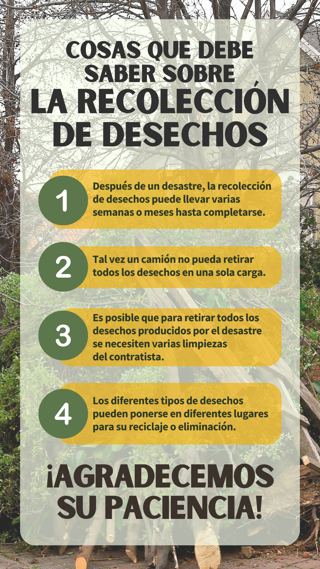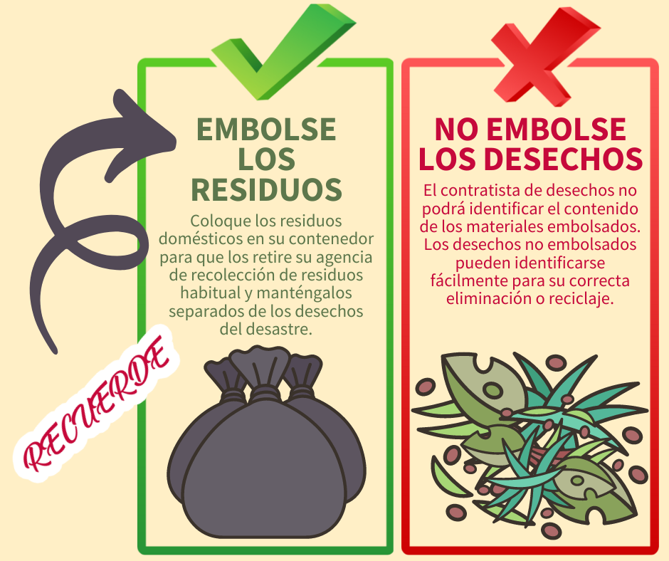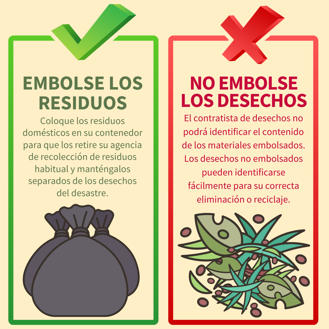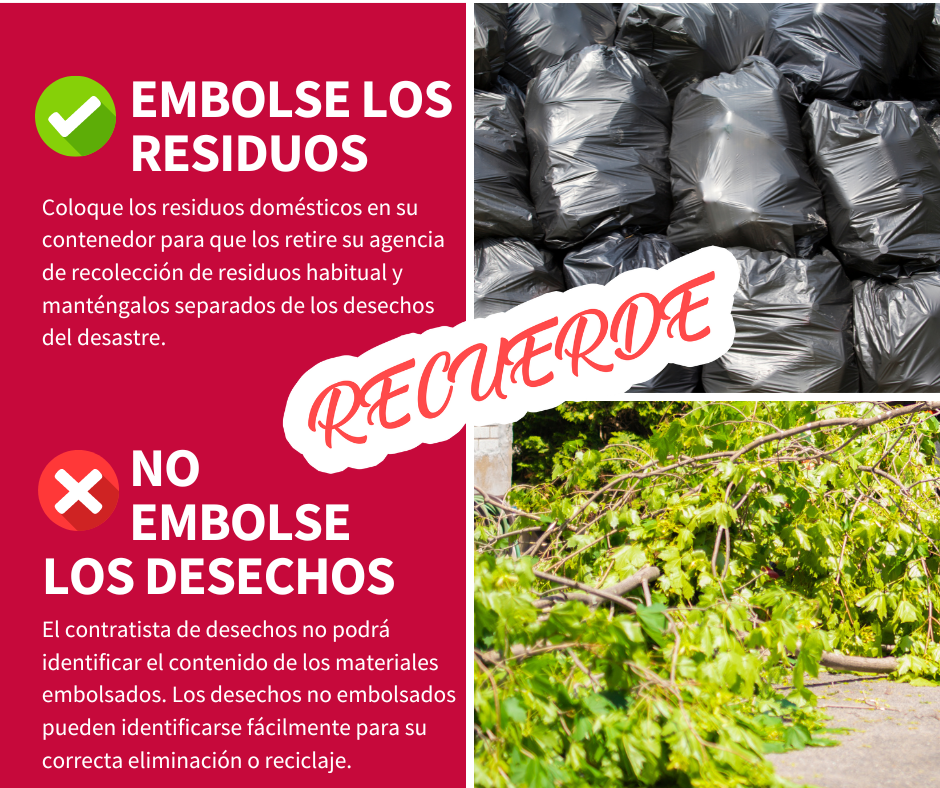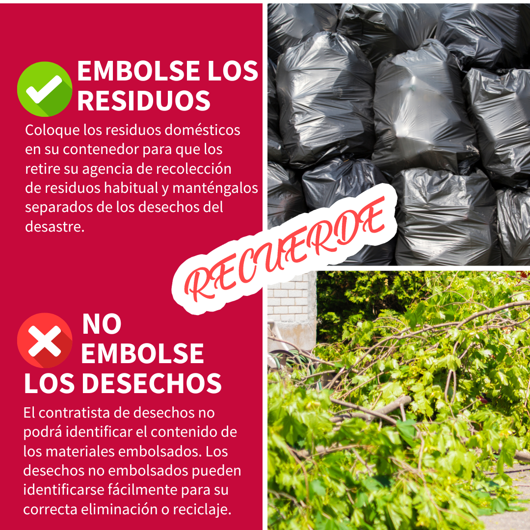 Desechos vs. residuos Para ayudar a acelerar la remoción de desechos del desastre, siga estos consejos: 🚫 NO COLOQUE SUS DESECHOS EN BOLSAS 👌 SOLO COLOQUE EN BOLSAS LOS RESIDUOS NORMALES ¡Mantener los desechos separados de los residuos ayudará a garantizar una recuperación más rápida de nuestra comunidad! Para más información, visite www.putlinkhere.com. Gracias por su cooperación. #DisasterDebris #DisasterRecovery |