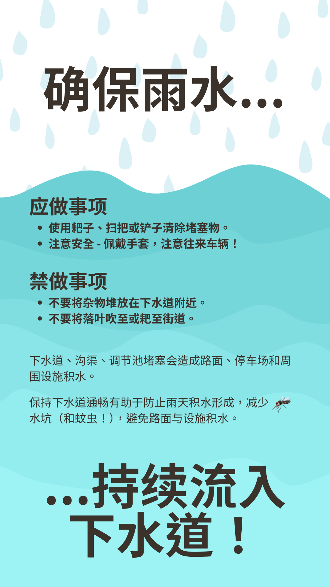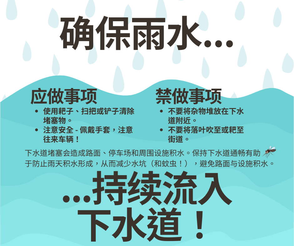 风暴排洪 确保雨水能够流进下水道! 应做事项: