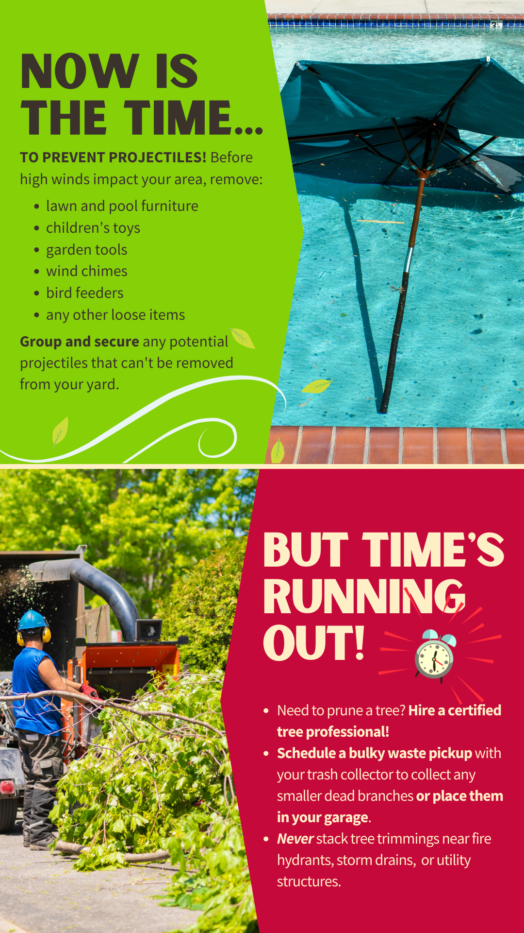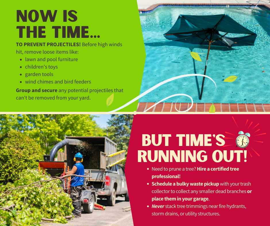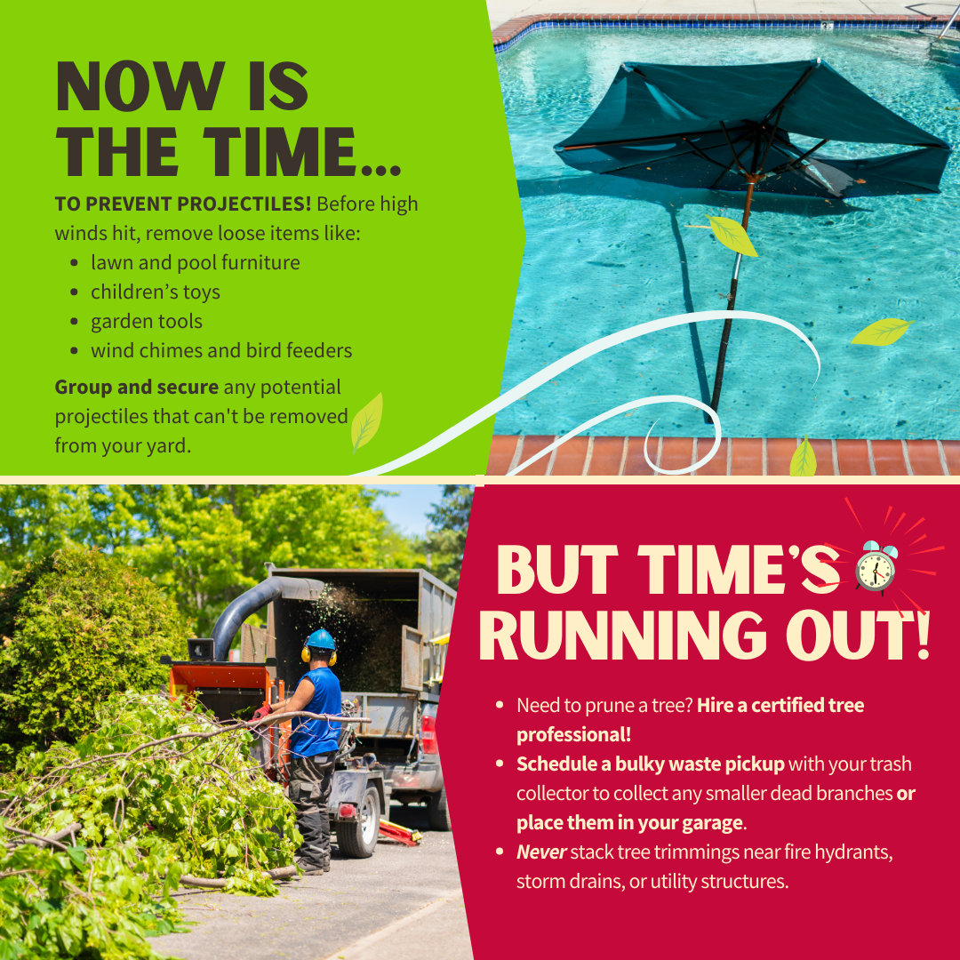MINIMIZE PROJECTILES ☝️ In preparation for (Tropical Storm/Hurricane Name), check your yard for potential wind-driven projectiles. Everyday objects around your home can become deadly missiles in high winds including lawn furniture, children’s toys, garden tools, wind chimes, bird feeders, etc. Items that can’t be removed should be grouped together and secured to prevent them from becoming airborne. 🌳 The time to trim your trees is before hurricane season. If you must prune a tree to prevent dead branches from potentially causing damage or harm, hire a certified tree professional. Schedule a bulky waste pickup with your trash collector to collect any smaller dead branches or place them in your garage until after the storm has passed. Never stack tree trimmings near fire hydrants, storm drains, guy wires, or utility structures. For more information, visit www.putlinkhere.com. We thank you for your cooperation. #StormPreparation #TropicalStormName/#HurricaneName |