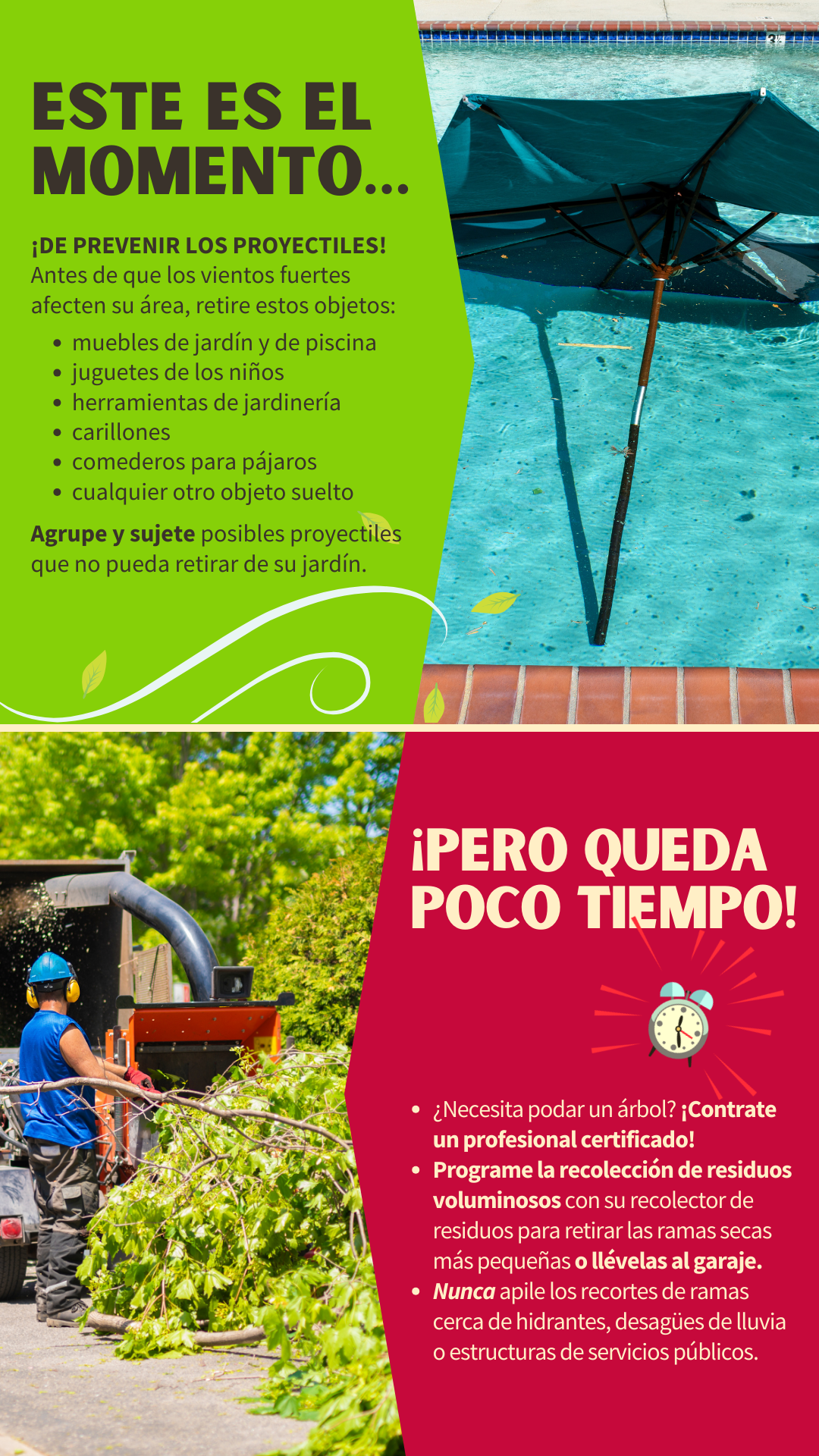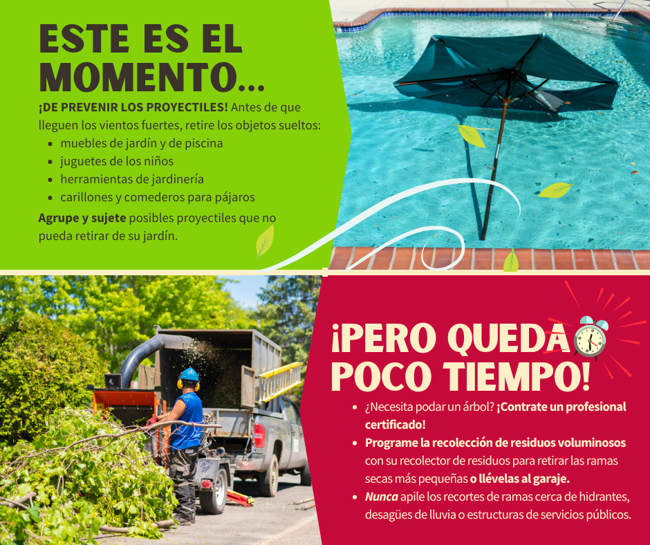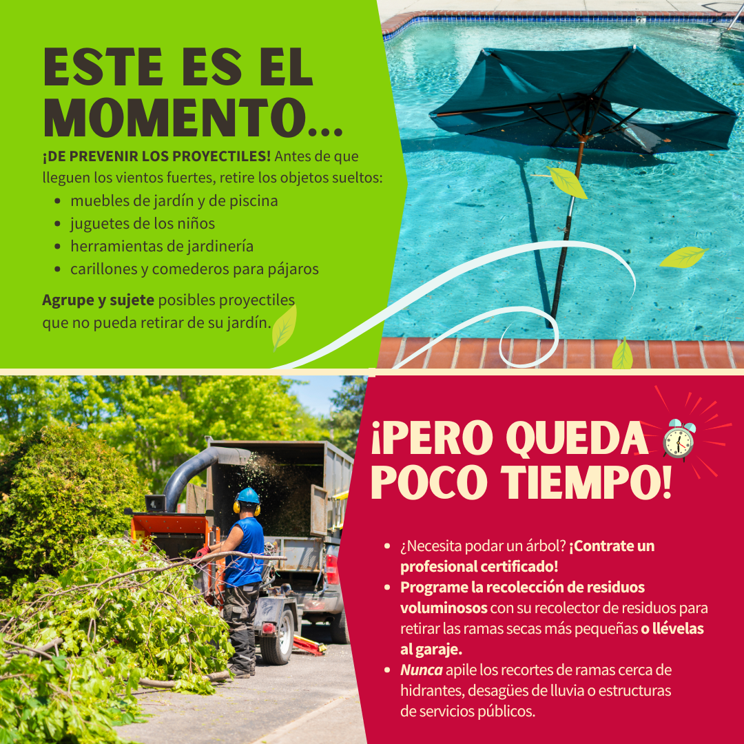Minimicemos los proyectiles ☝️ En preparación para (nombre de la tormenta tropical/huracán), revise su jardín en busca de posibles proyectiles que pueda impulsar el viento. Con los vientos fuertes, los objetos de uso diario de su hogar pueden convertirse en misiles mortales, como los muebles de jardín, los juguetes de los niños, las herramientas de jardinería, los carillones, los comederos para pájaros, etc. Los objetos que no puedan retirarse deben agruparse y atarse para evitar que vuelen por el aire. 🌳 El momento de podar los árboles es justo antes de la temporada de huracanes. Si necesita podar un árbol para evitar posibles daños o destrozos causados por ramas secas, contrate a un profesional certificado. Programe una recolección de residuos voluminosos con su recolector de residuos para retirar las ramas secas más pequeñas o llévelas al garaje hasta que haya pasado la tormenta. Nunca apile los recortes de ramas cerca de hidrantes, desagües de lluvia, cables de sujeción o estructuras de servicios públicos. Para más información, visite www.putlinkhere.com. Gracias por su cooperación. #StormPreparation #TropicalStormName/#HurricaneName |
