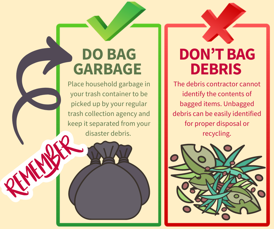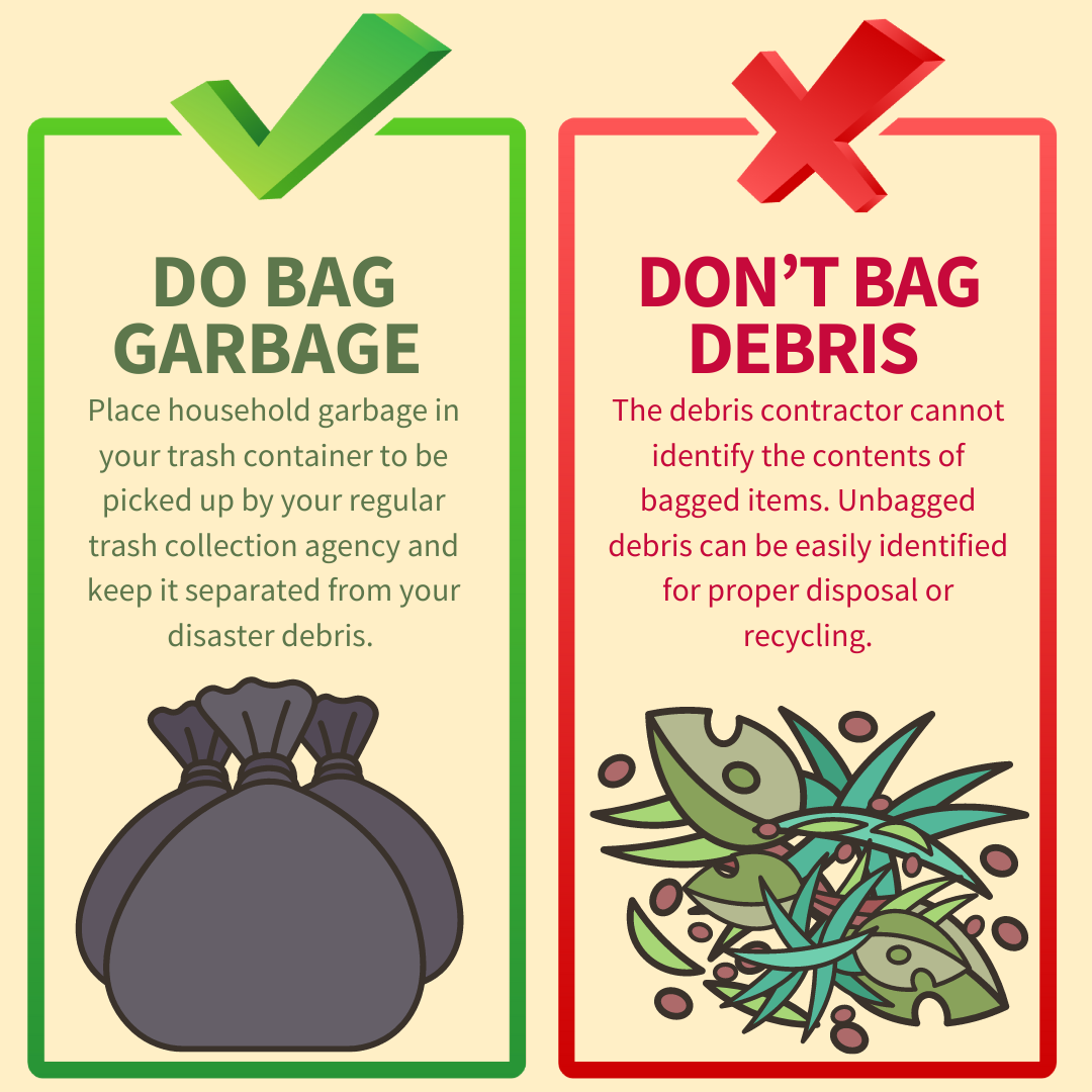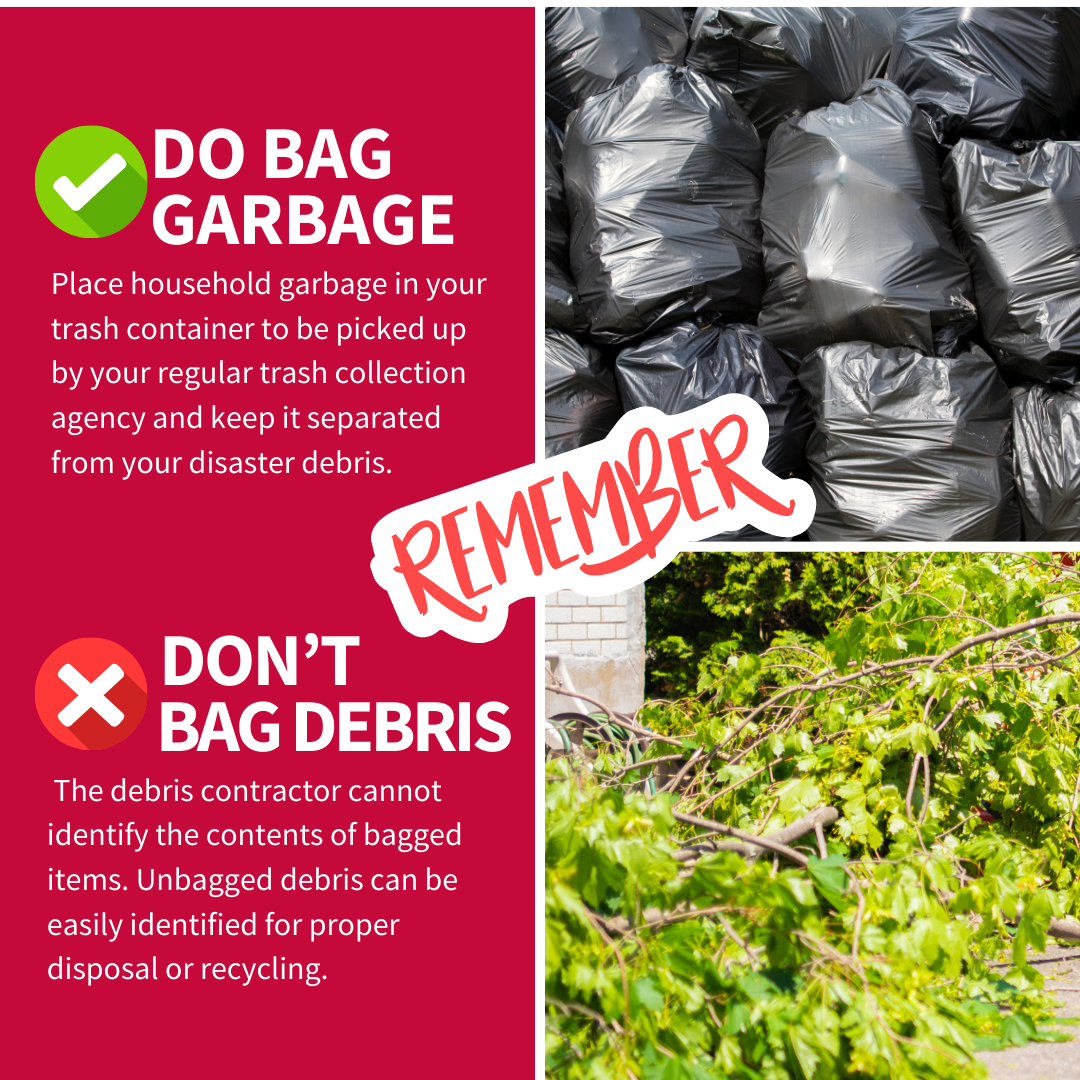 DEBRIS vs. TRASH To help speed up the removal of disaster debris, follow these tips: 🚫DON’T BAG YOUR DEBRIS 👌DO BAG REGULAR GARBAGE Keeping your debris and trash separated will help ensure a faster recovery of our community! For more information, visit www.putlinkhere.com. We thank you for your cooperation. #DisasterDebris #DisasterRecovery |