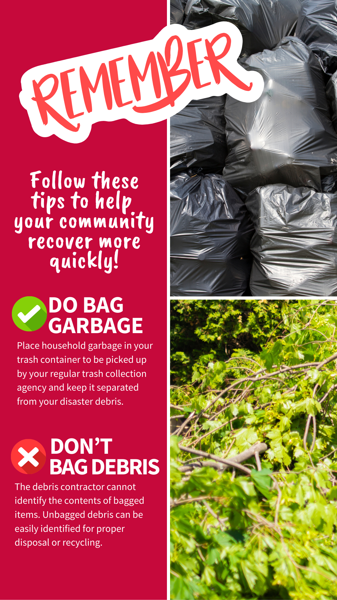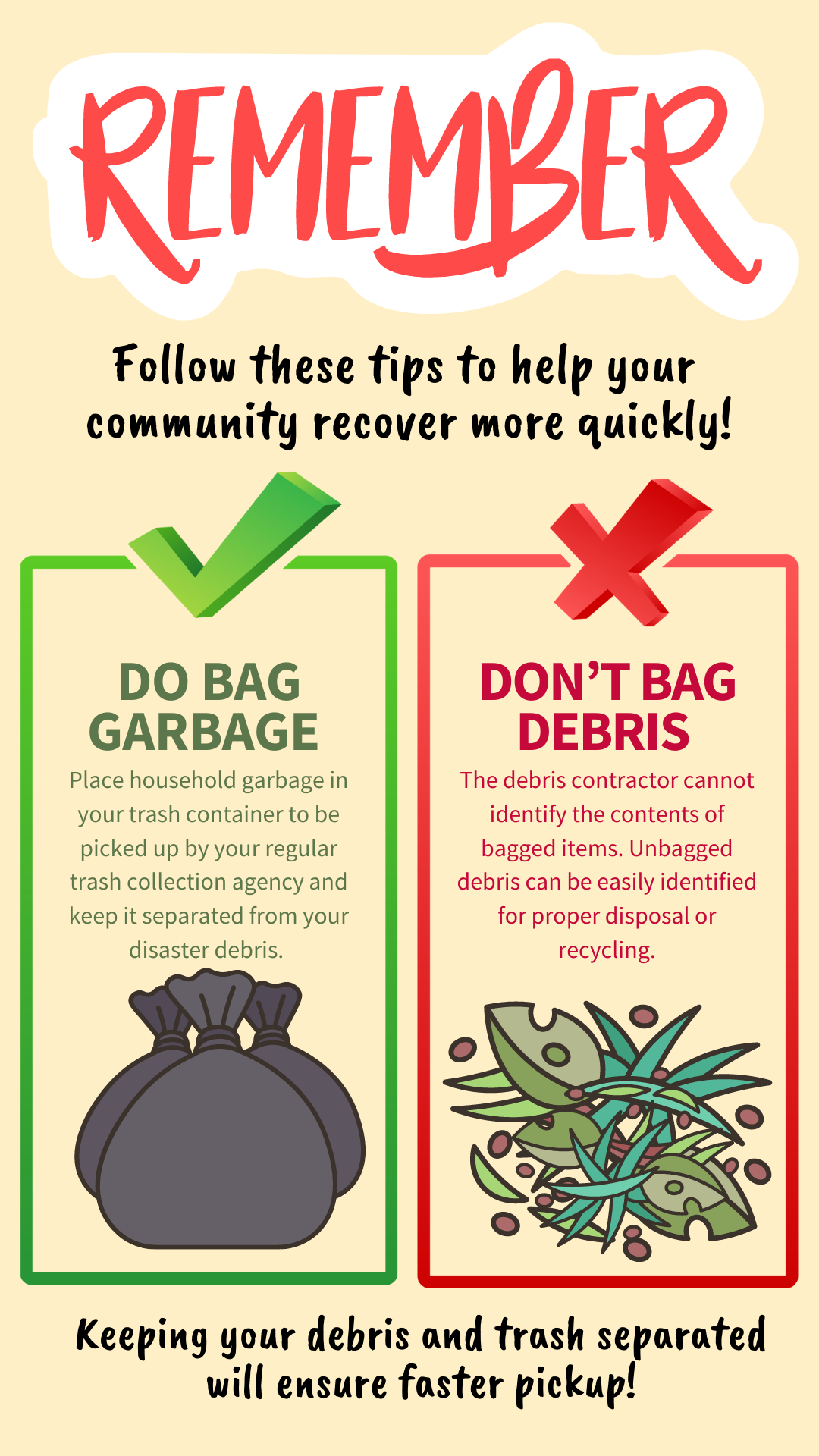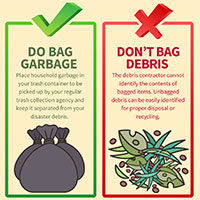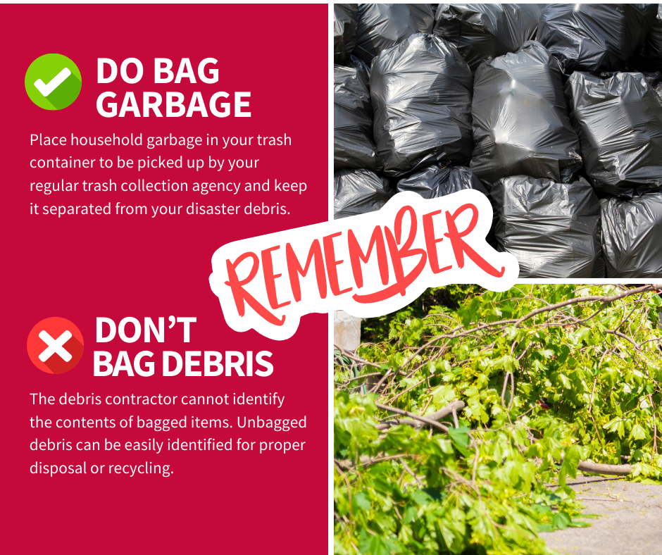 DEBRIS vs. TRASH To help speed up the removal of disaster debris, follow these tips: 🚫DON’T BAG YOUR DEBRIS 👌DO BAG REGULAR GARBAGE Keeping your debris and trash separated will help ensure a faster recovery of our community! For more information, visit www.putlinkhere.com. We thank you for your cooperation. #DisasterDebris #DisasterRecovery |