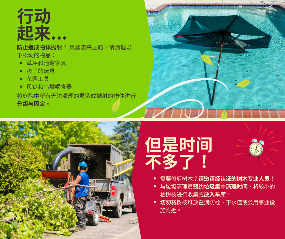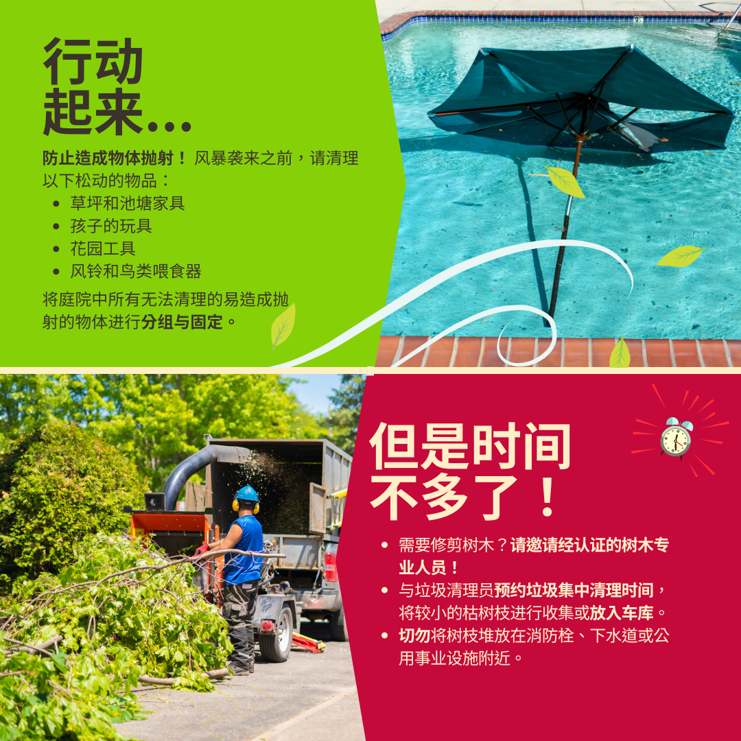 减少抛物危害 ☝️ 为防范(热带风暴/飓风名称),请检查您的院落中是否存在可能因大风而成为抛物的物体。家中的日常物品在大风中可能变成致命抛物,包括草坪家具、孩子的玩具、花园工具、风铃、鸟食槽等。无法移除的物品应集中存放并进行固定,防止其被吹离地面。 🌳 飓风季节前应对树木进行修剪。如果您必须修剪树木,防止枯枝造成潜在损害或伤害,请寻求资质合格的树木专家进行处理。与垃圾清理员预约垃圾集中清理时间,将较小的枯树枝进行收集或放入车库,直至风暴结束。切勿将树枝堆放在消防栓、下水道、电线或公用事业设施附近。 要查看更多信息,请访问 www.putlinkhere.com。感谢您的配合。 #风暴防范 #热带风暴名称/#飓风名称 |