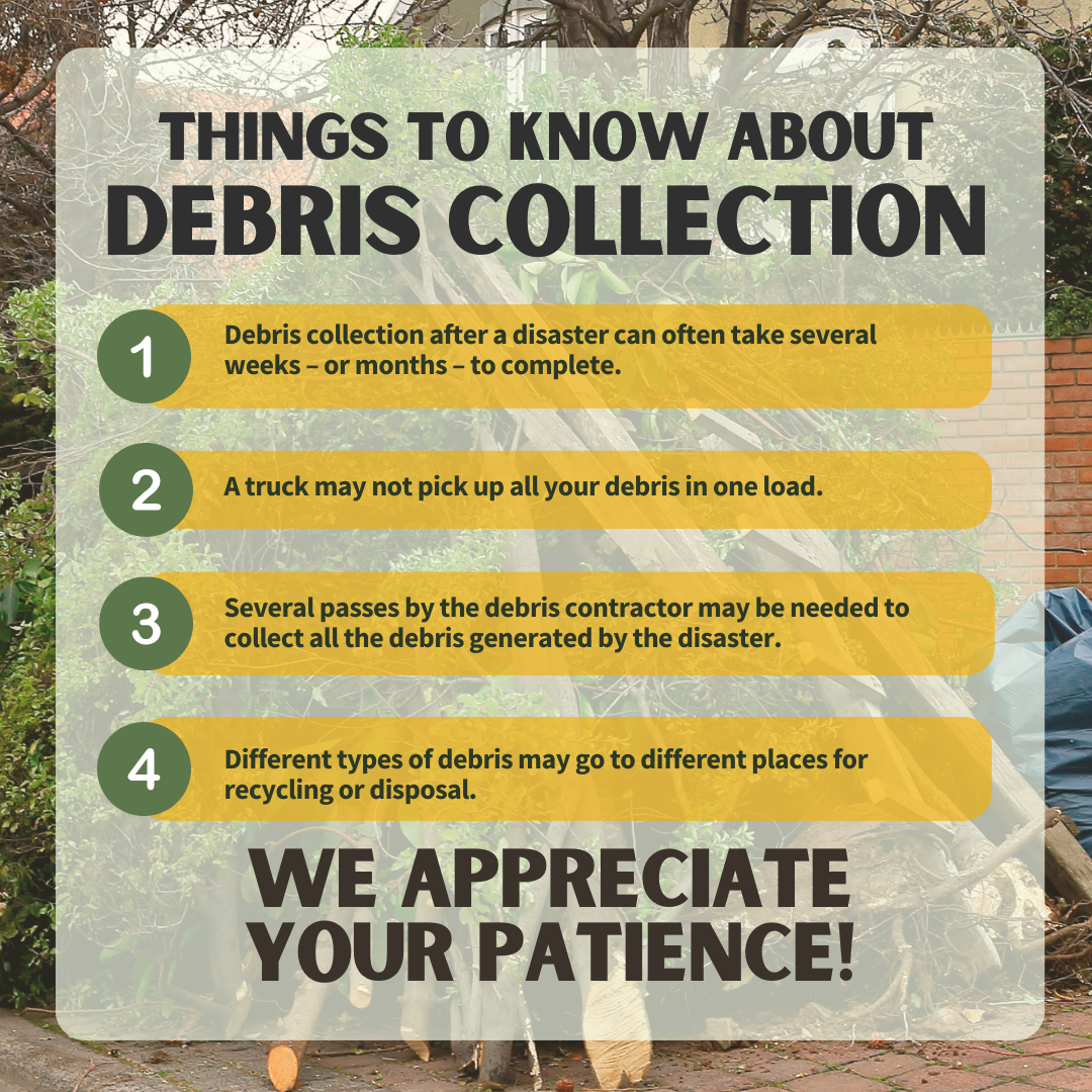 TIMELINE OF DEBRIS OPERATIONS Staff and contractors are working diligently to pickup debris as quickly and as safely as possible. We appreciate your patience. As cleanup continues, keep this in mind: